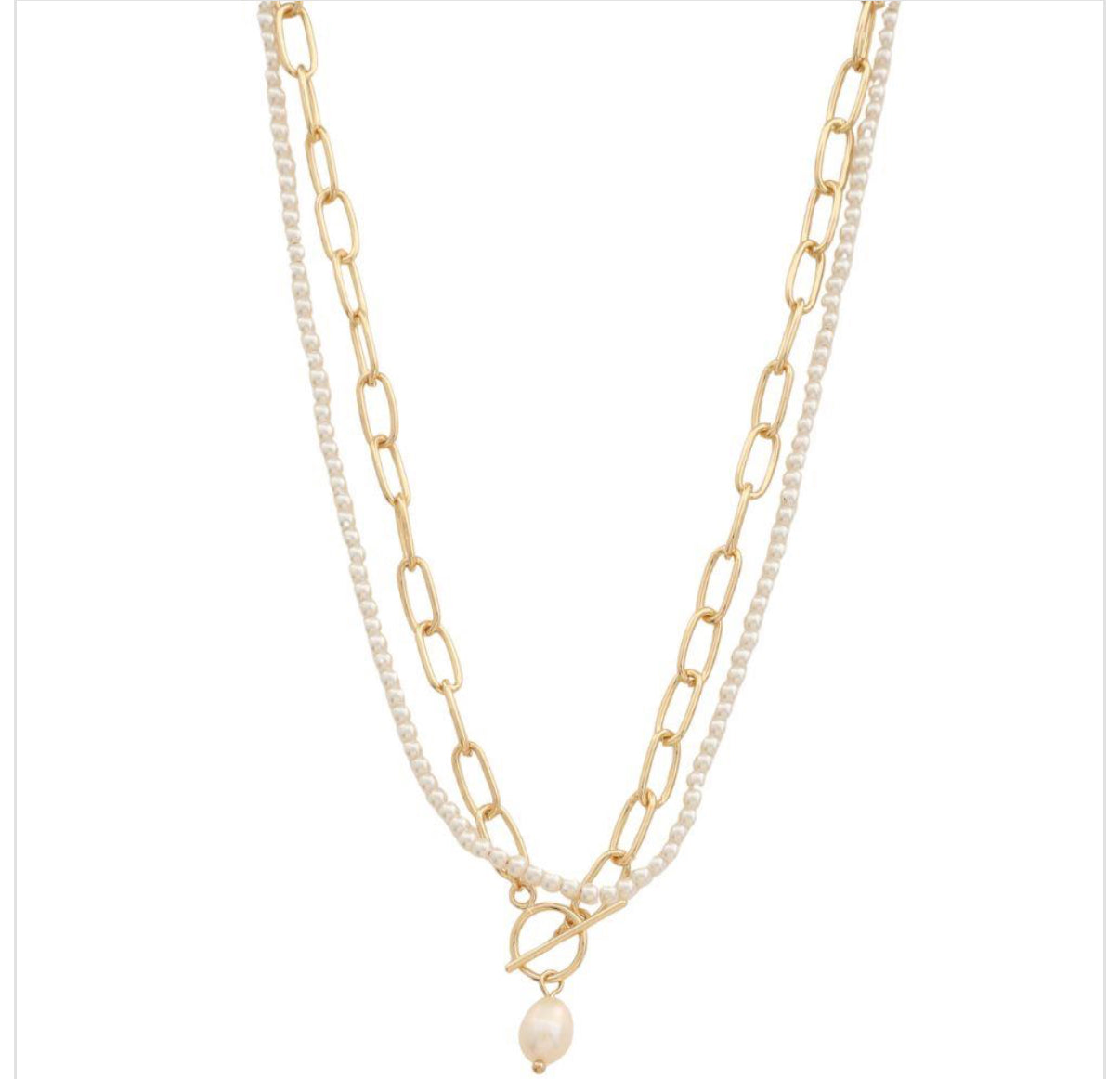 - Faux pearl beaded strand + gold-dipped link chain