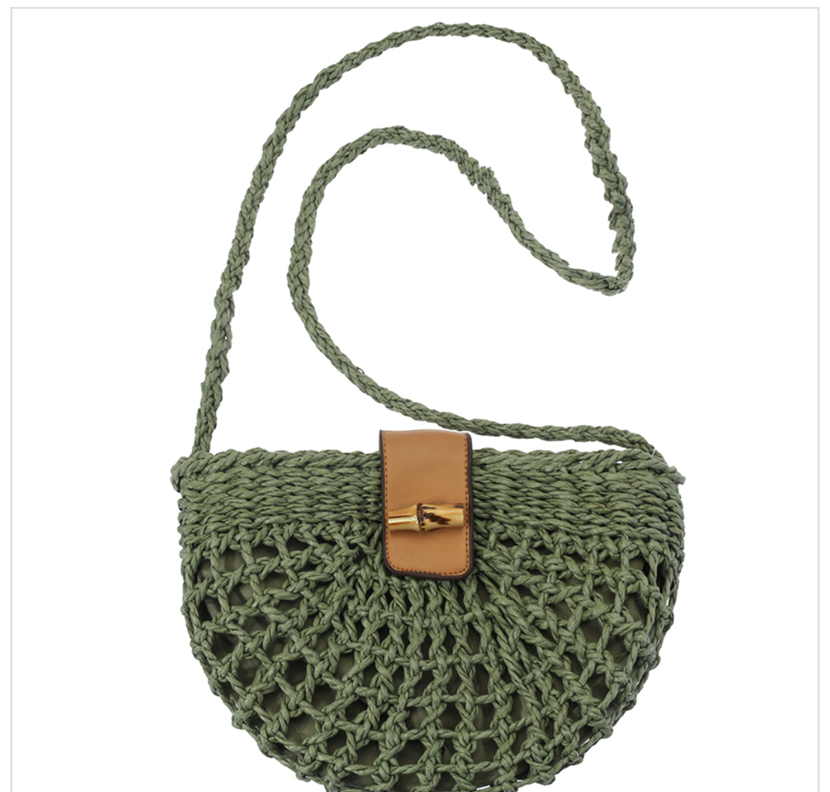 Minimal, natural, and effortlessly cool — the Shoreline Crossbody is made for vacation days when you want to travel light and stay stylish. Featuring an open-weave raffia design with a soft fabric lining, this half-moon shaped bag closes with a faux leather strap and bamboo-style toggle clasp. The braided crossbody strap keeps it hands-free and ready for anything, whether you’re beachside or browsing the local market. Available in Olive or Khaki.