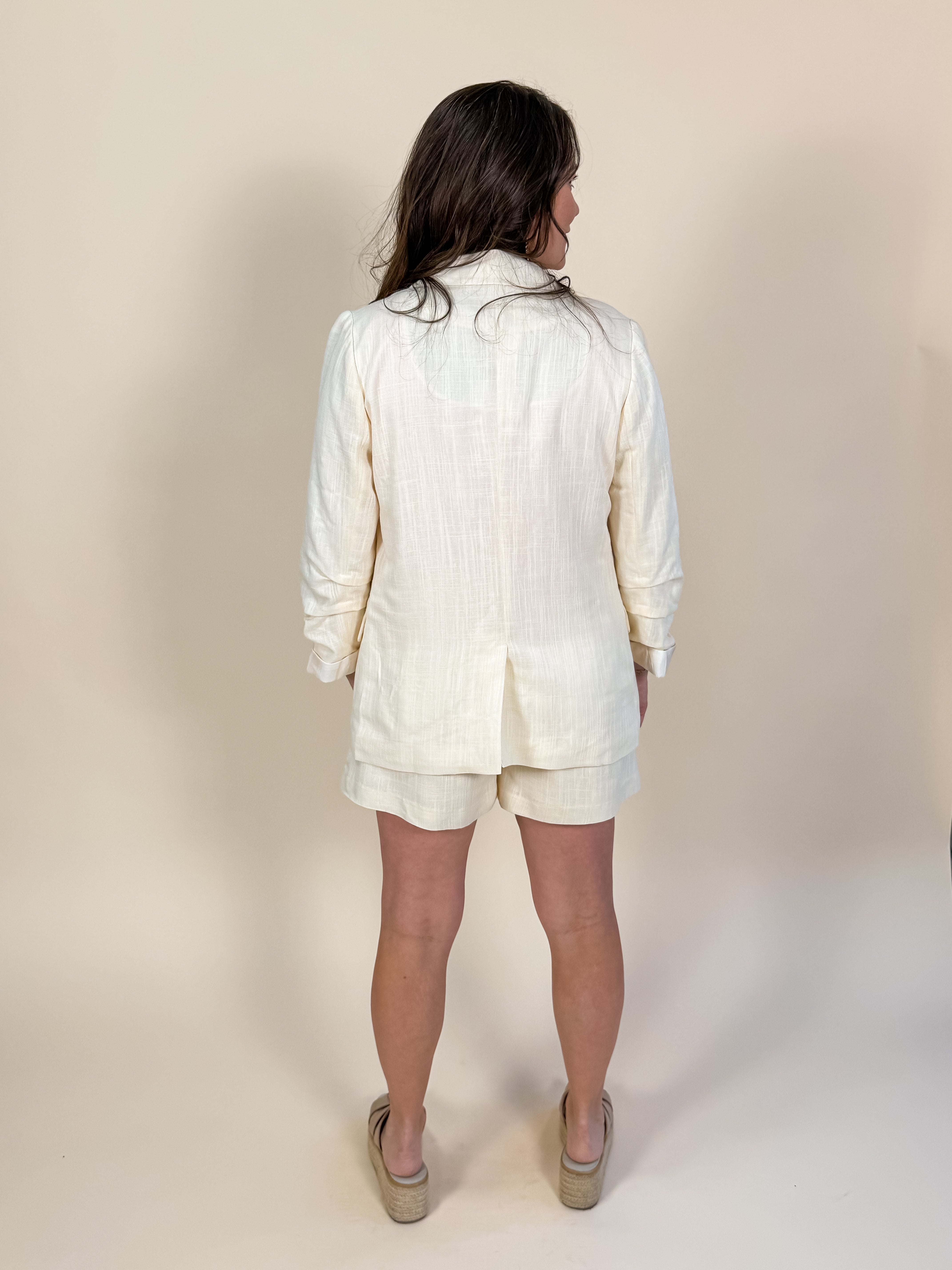 A modern take on classic tailoring, the Maison Cinched Sleeve Blazer brings effortless polish to warm-weather styling. Designed with a sleek, tailored silhouette and softly cinched sleeves, this lightweight blazer offers structure without feeling heavy. Perfect for layering over dresses, tees, or matching sets, it transitions seamlessly from daytime exploring to evening dinners.