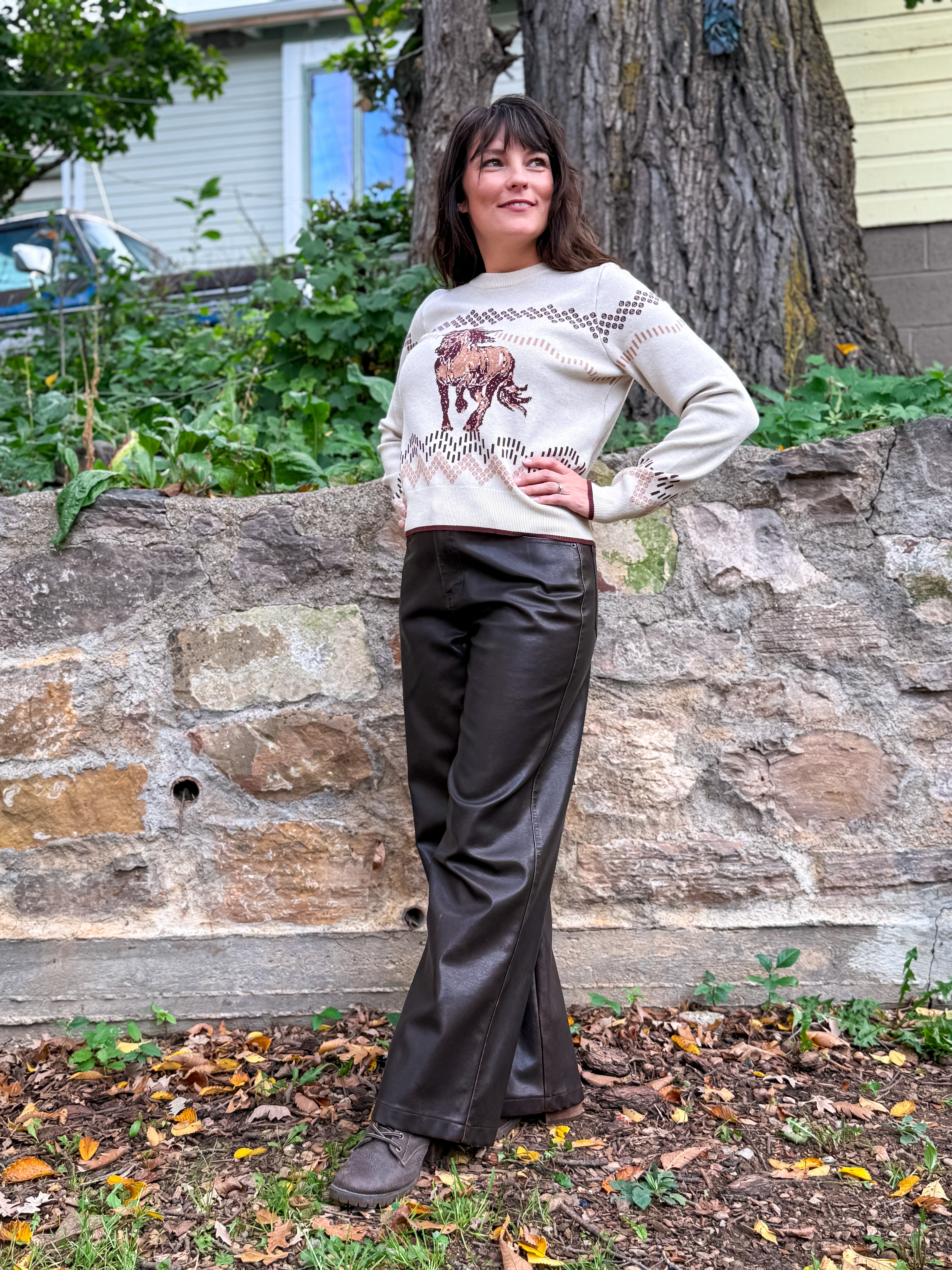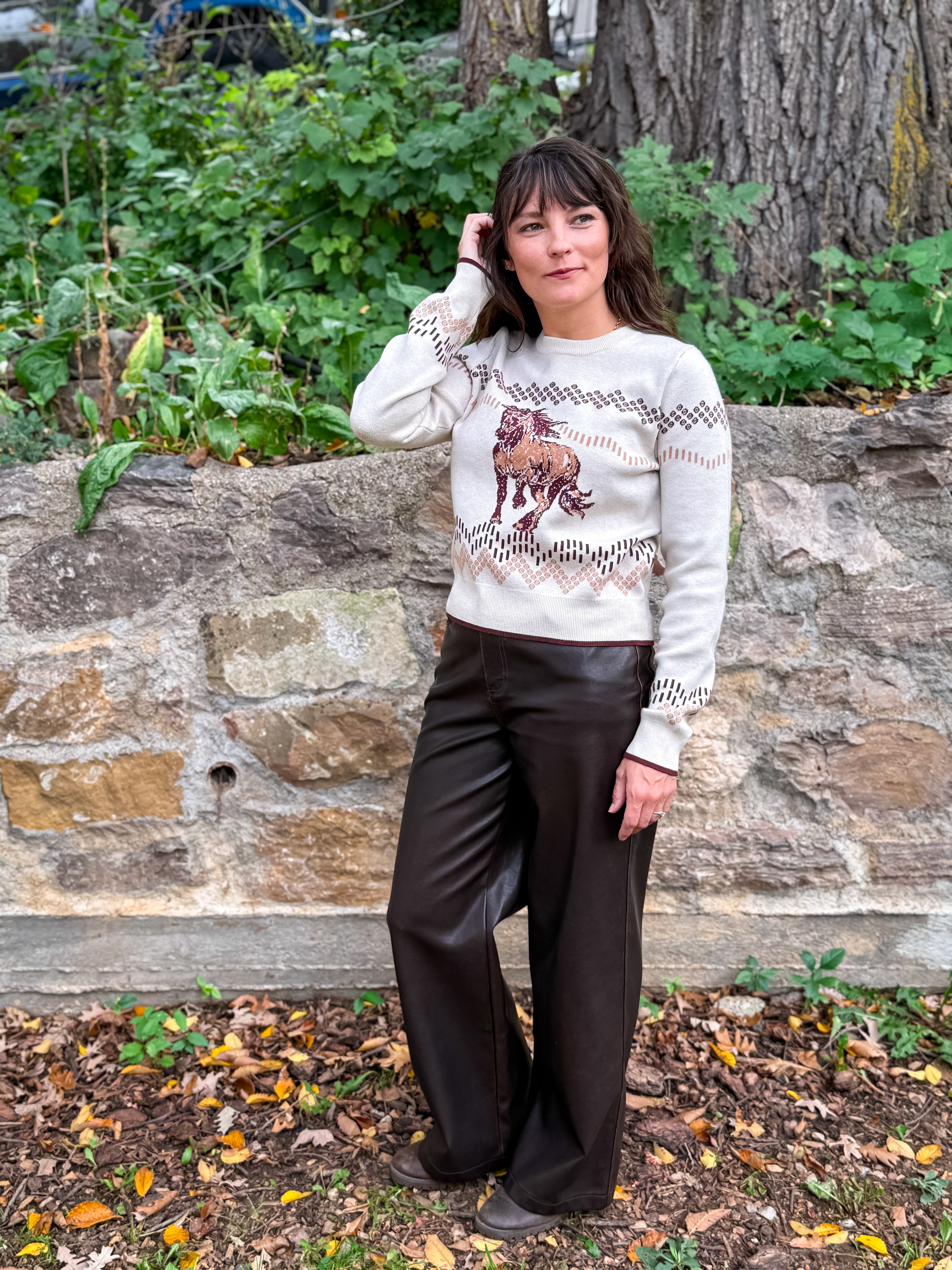 Ride into effortless style with the Wild Run Horse Sweater. Designed in a soft knit this sweater features a bold horse graphic across the front, framed by a western-inspired pattern for a touch of rustic charm. The crew neckline and ribbed trim give it a classic finish, while the neutral tones make it easy to pair with denim, skirts, or trousers.