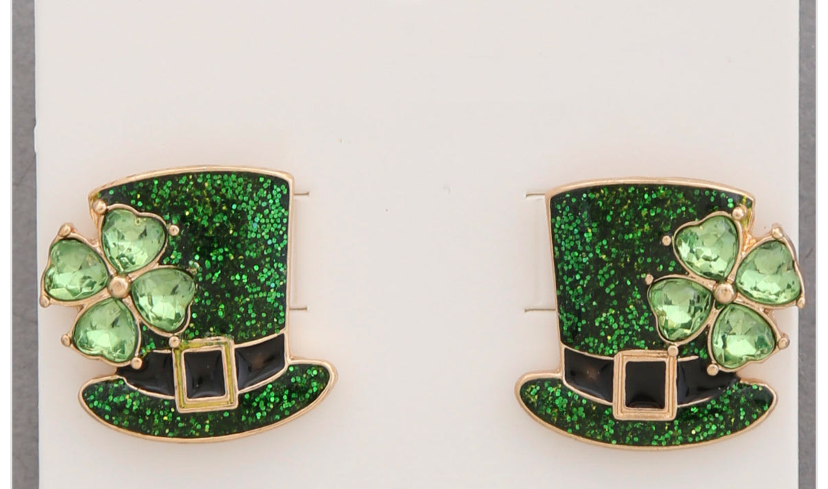 Top off your St. Patrick’s Day look with a little sparkle and charm. The Lucky Hat Earrings feature glittery green top hats adorned with gem-studded clovers and a black belt detail. A festive finishing touch for your holiday outfit — or any day you’re feeling lucky.