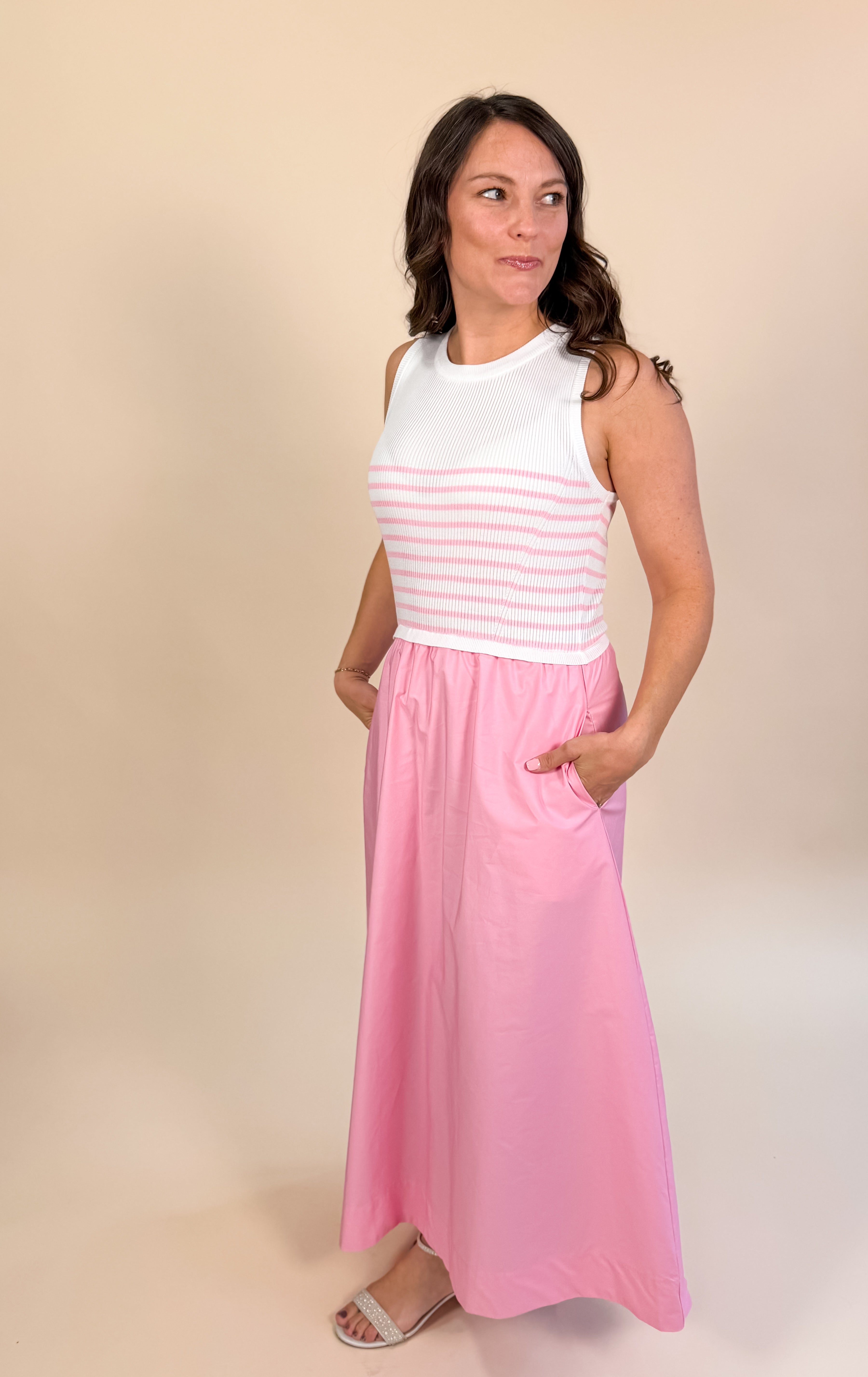 The subtle stripe detail through the top adds texture and interest, while the airy midi skirt brings movement and lightness. Perfect for Love Notes styling now and seamlessly transitioning into vacation days ahead, this is a dress you’ll reach for again and again.
