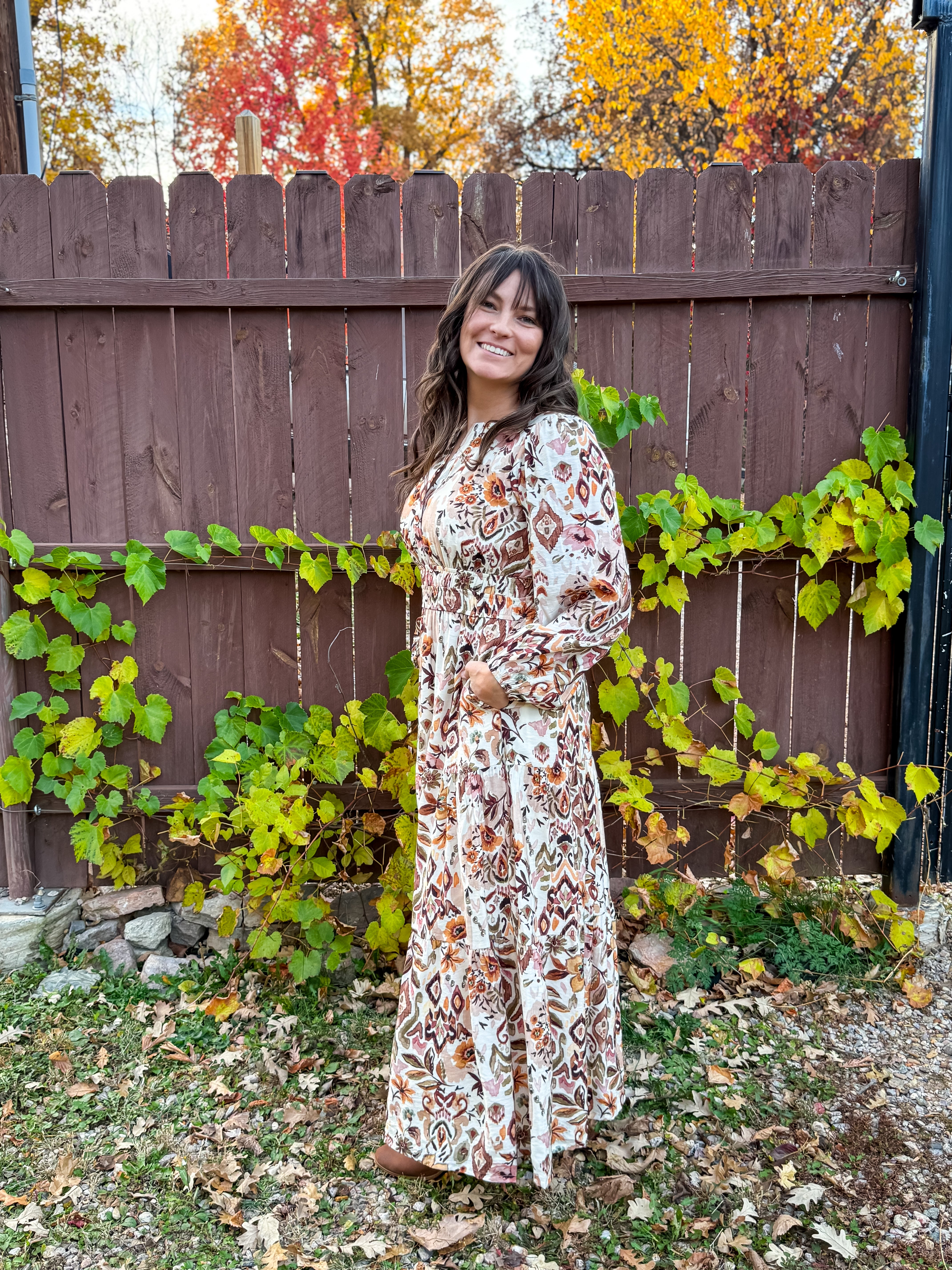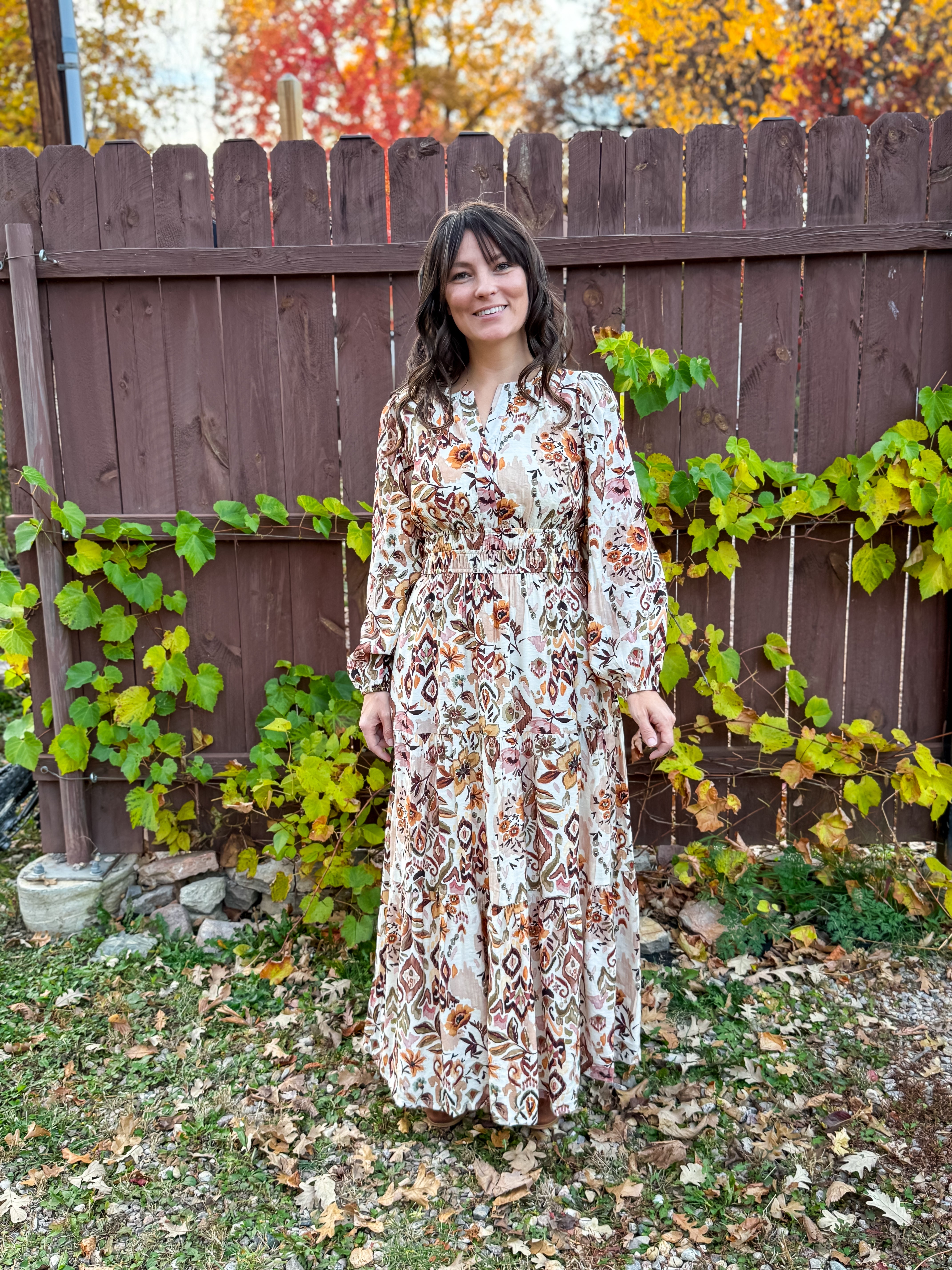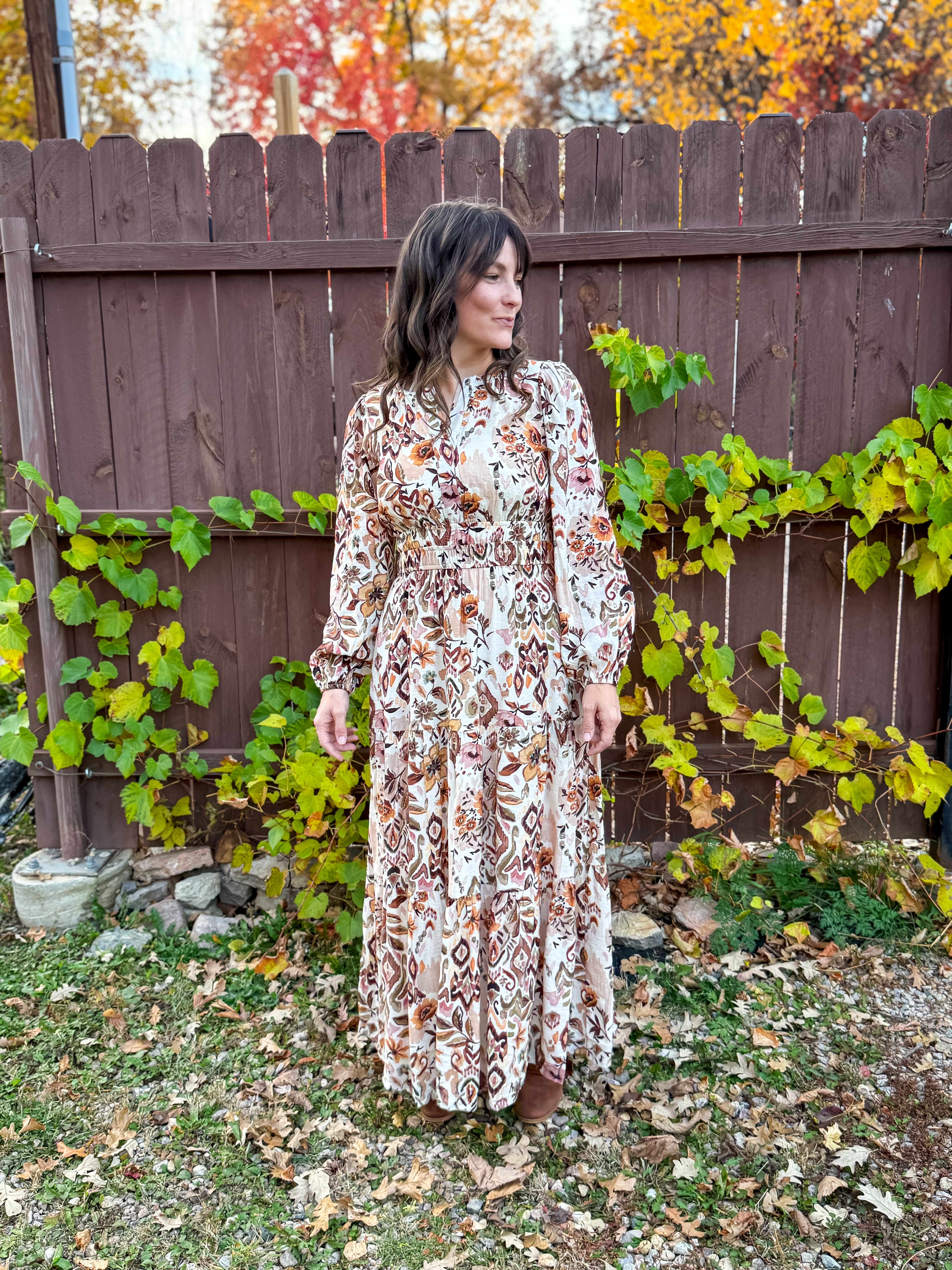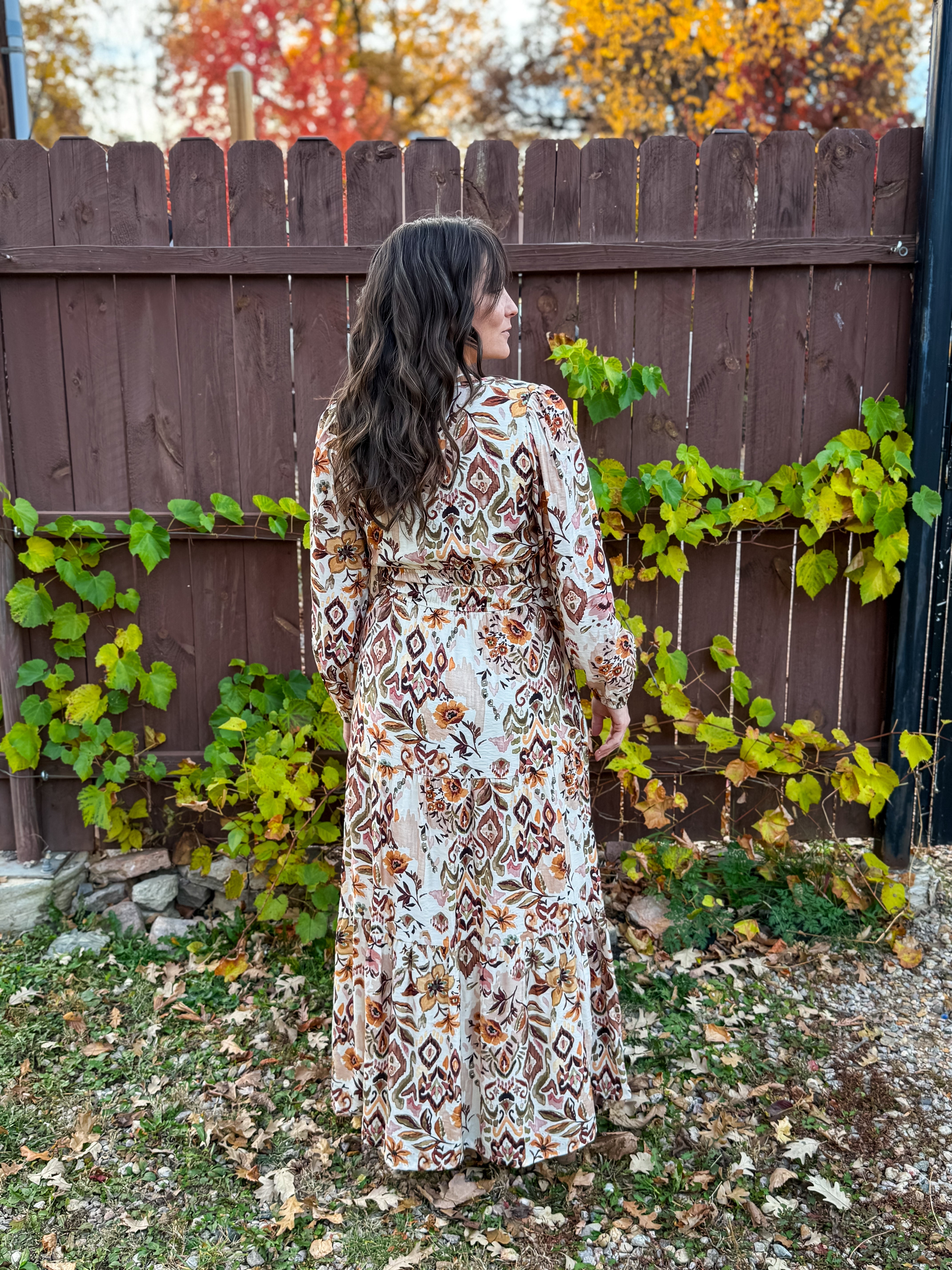 With a tiered silhouette, long sleeves, and an intricate woven print in warm gold and clay tones, it’s the perfect piece for everything from fall outings to spring events. A soft lining and hidden side pockets add a touch of practicality to its flowy, feminine feel.