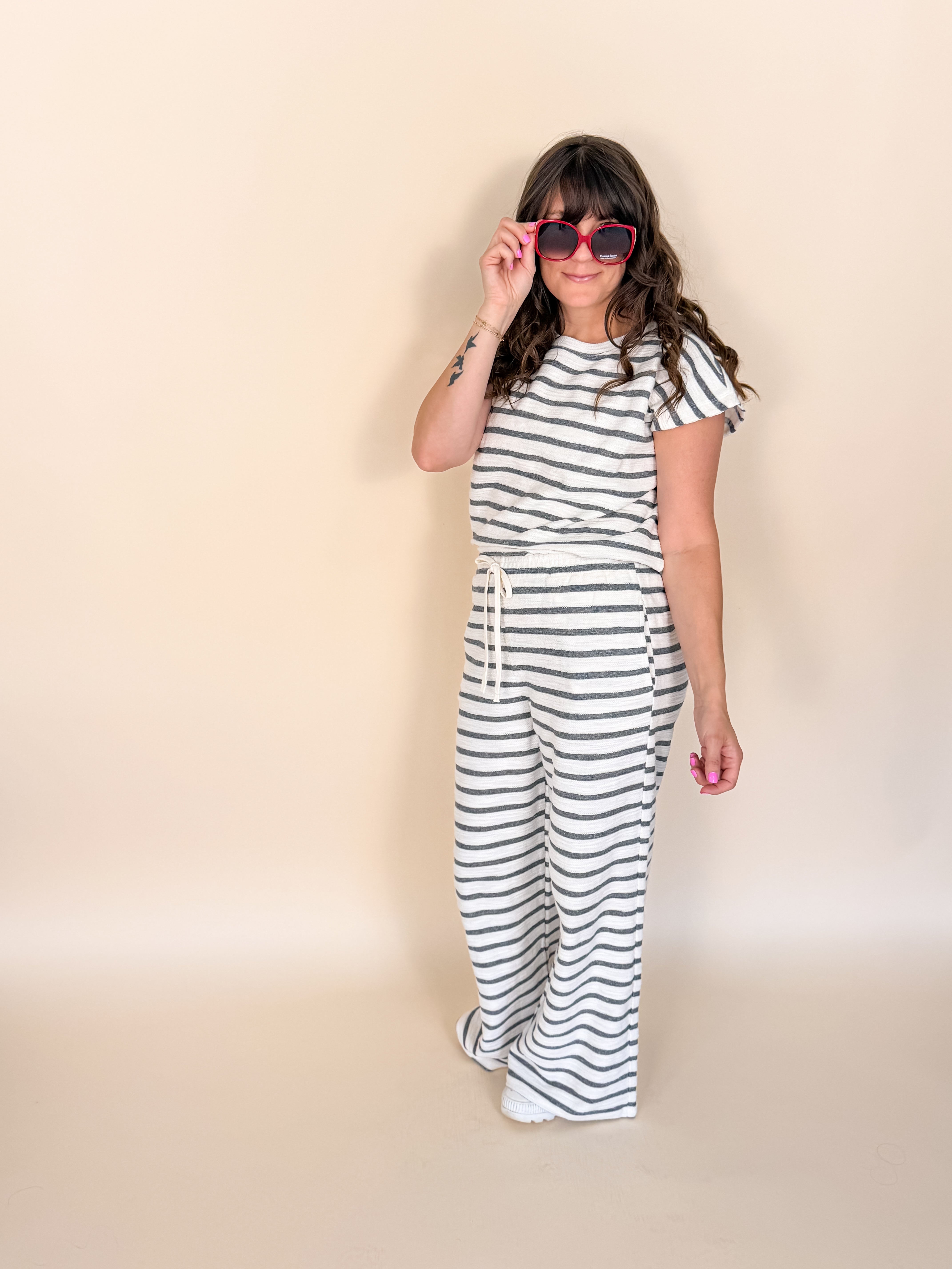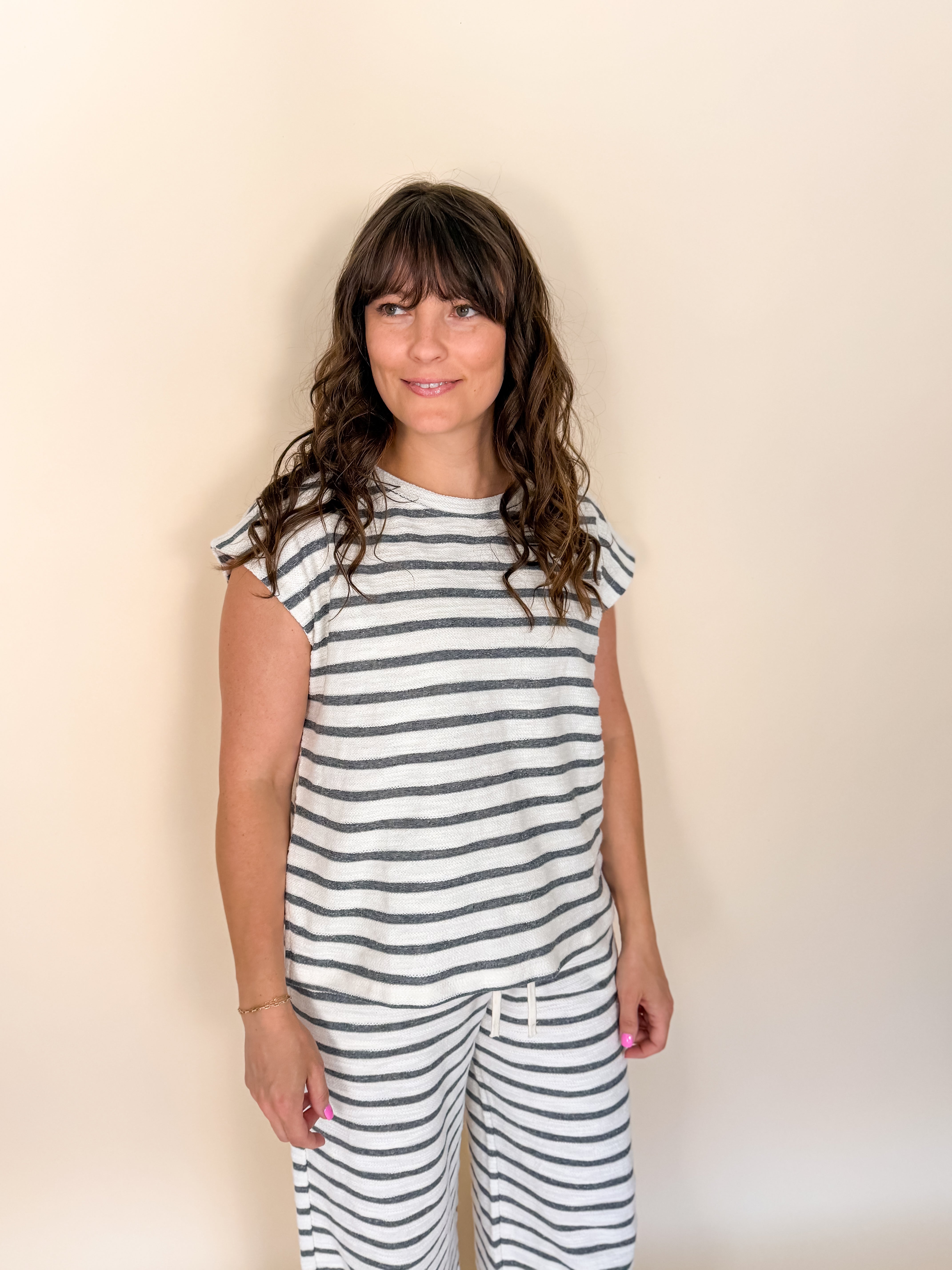 Striped knit top with relaxed fit and short sleeves styled with matching lounge pants